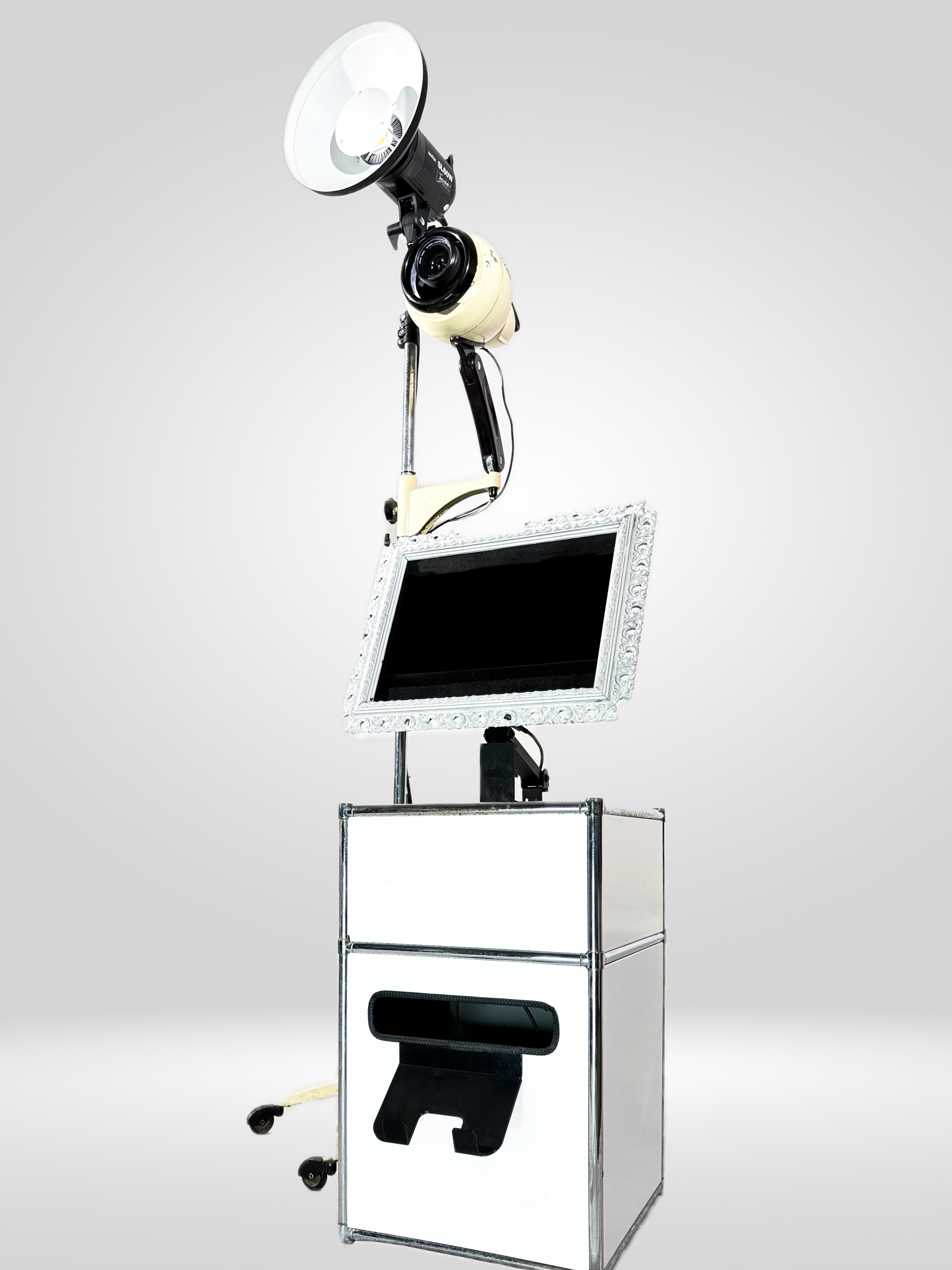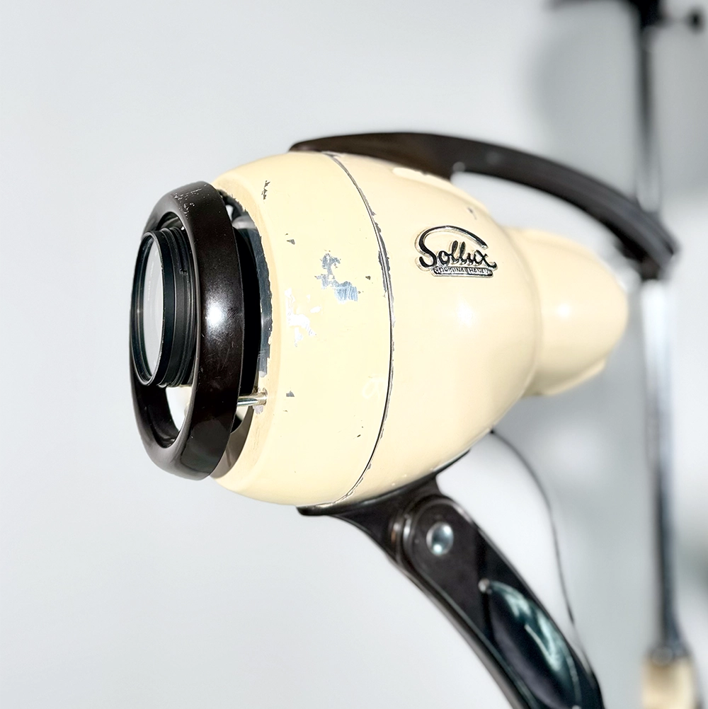 Unsere Fotobox-Kamera steckt in einem echten Designklassiker: einer originalen Sollux Hanau Lampe, die liebevoll und aufwendig zu einem einzigartigen Kameragehäuse umgebaut wurde. Ursprünglich in den 1930er/40er-Jahren als medizinische Lichtlampe entwickelt, überzeugt die Sollux Hanau durch ihr ikonisches Bauhaus-Design, robuste Materialien und markante Formgebung.